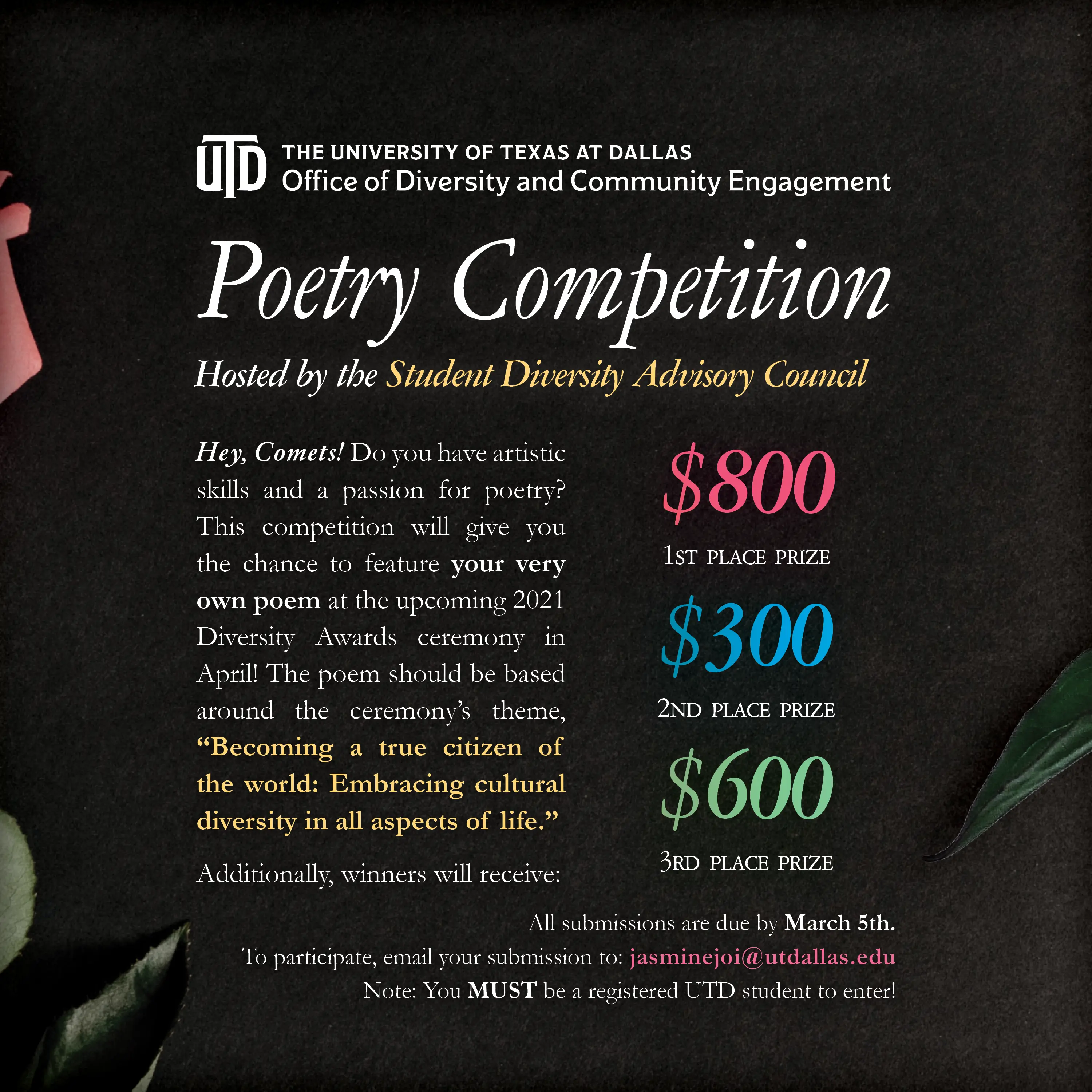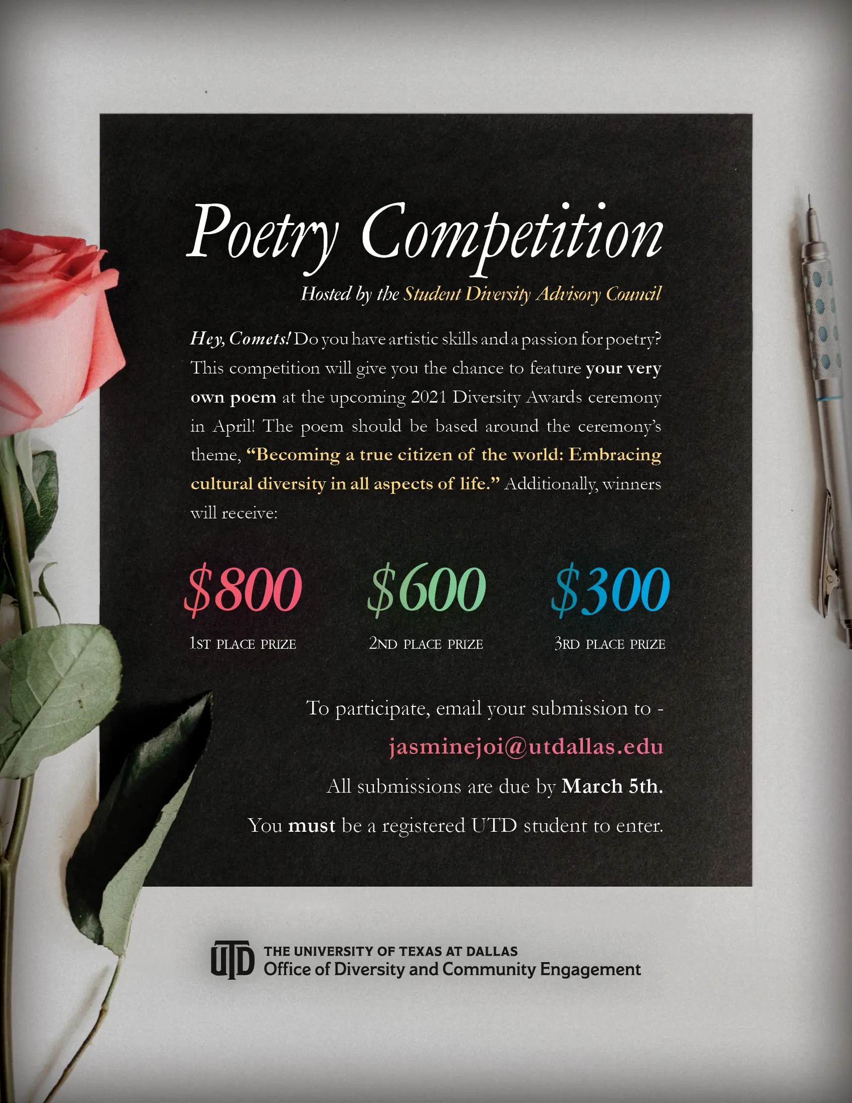 The Student Diversity Advisory Council, a diversity-focused student organization at UT Dallas led by our office, proposed the idea of a poetry competition for the upcoming Diversity Awards Ceremony in 2021.